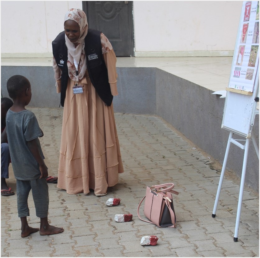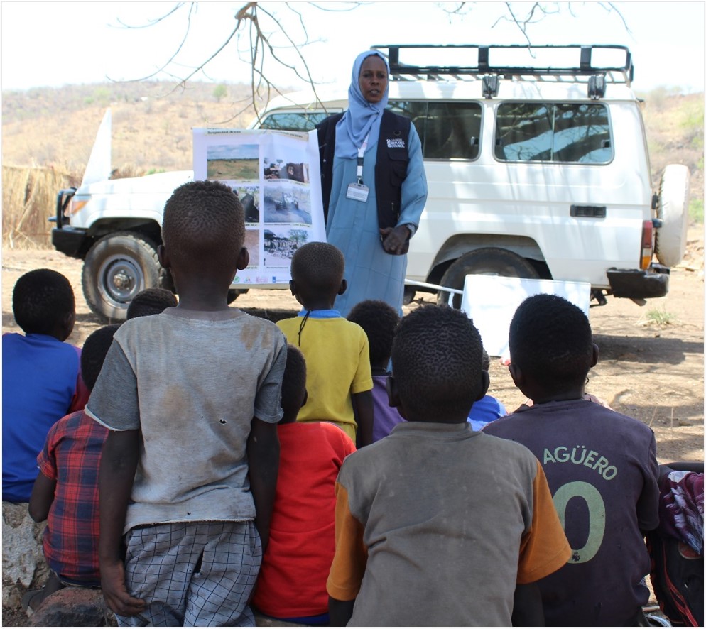 Rasha Alamin, an Explosive Ordnance Risk Education (EORE) Team Leader with Danish Refugee Council, recalls a story from her childhood. A couple of her schoolmates were playing outside in their village near Kadugli in Sudan’s South Kordofan state. The village is close to a military base, and one day the children found a strange metal object that piqued their interest. When one of them lifted it, it exploded. He died immediately; his friend had to have a leg amputated.