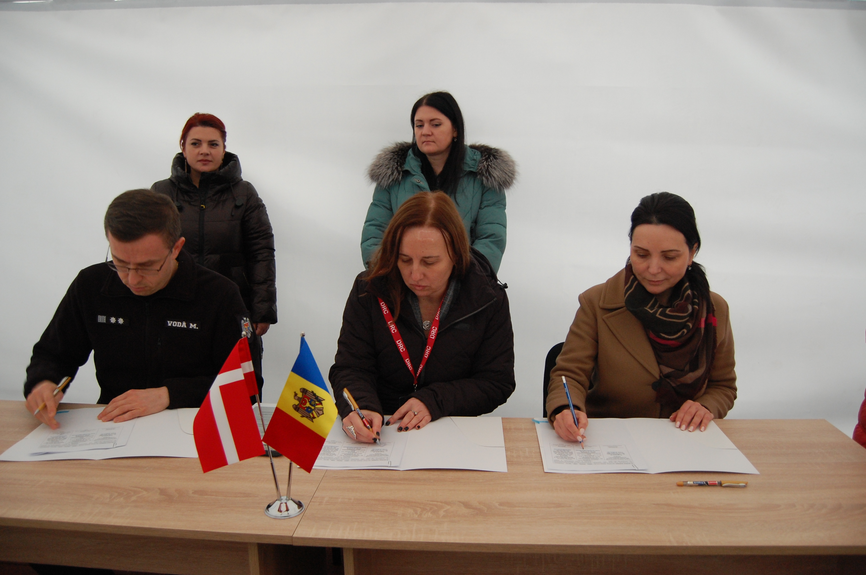 Representatives of the Republic of Moldova's Bureau of Migration of Asylum - DRC Danish Refugee Council's Ana Povrzenic, Country Director for Poland, Moldova and Romania - along with partner NGO IVC signs agreement to confirm results delivered at the asylum center in Chisinau - photo by Alexandra Strand Holm/DRC