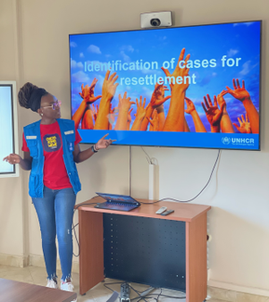 Cynthia: We did both in-person and online training. My first training was on Teams, and I was meant to train protection staff on the identification of cases for resettlement. I remember that after my first training, one of the staff came back and asked: “Hey could you send me the training? I found it useful, please share the material.” And I was like ooh, maybe it was okay. Maybe it was useful. So that was my first training, and I loved the experience.