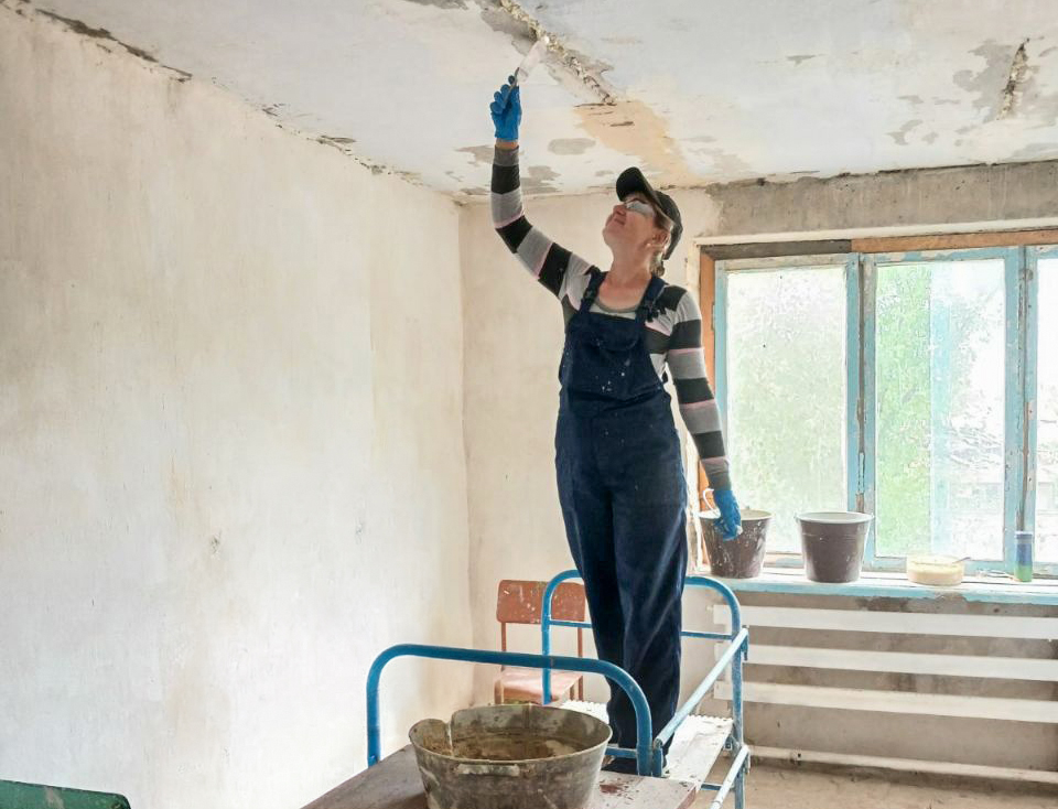 Tetiana, 42, mixes the plastering mortar, takes it with a large spatula, and applies it to the wall with a practised hand. Each movement is precise, smoothing and levelling the plaster with care. Despite the physical demands of the job, Tetiana works with a smile.